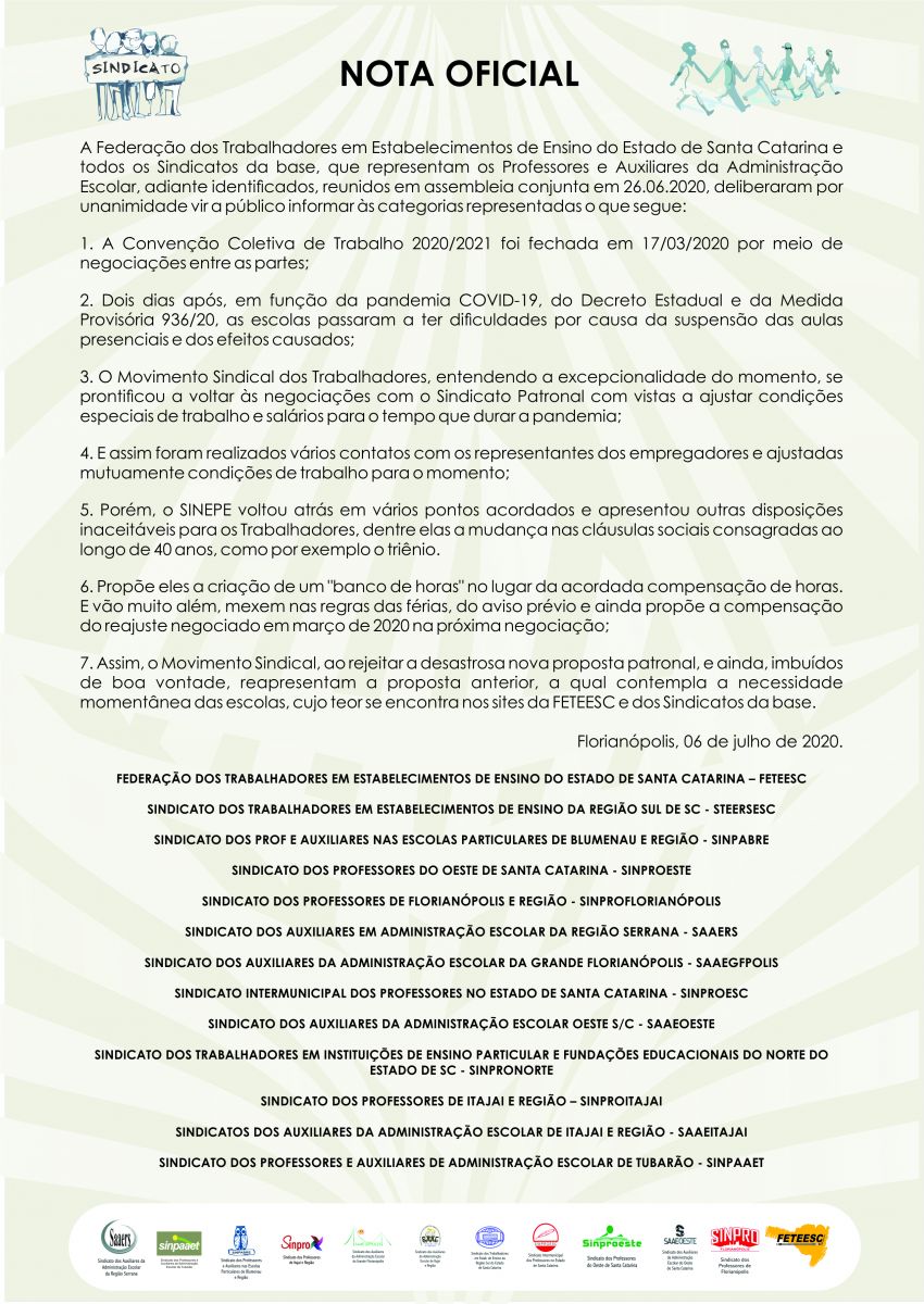 O SAAE Oeste, juntamente com os demais sindicatos da categoria vem negociando junto ao Sinepe (Sindicato Patronal) a Convenção Coletiva de Trabalho - CCT 2020-2021. Inúmeras foram as tentativas em assinarmos a CCT, garantindo a renovação das cláusulas sociais e ajustes nas cláusulas econômicas. Entretanto, o Sinepe tem dificultado o avanço da negociação, conforme explica a Nota em Anexo.